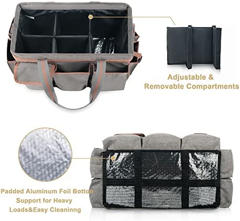 Adjustable Divider Boards: The versatile divider panels in the caddy organizer can be easily adjusted to accommodate various bottle sizes and shapes using Velcro. They keep the bottles upright, preventing them from falling or toppling over when you move or bend. The removable base board can be easily cleaned in case of spills or messes.