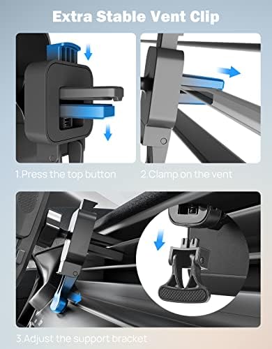 【Stable Structure】The adjustable support bracket of the vent clip can be adjusted to max. 90° against the car air vent surface, which fits the vent perfectly without wobbling, keeping your phone secure and stable while on the road.