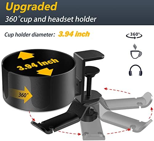 【360° Rotation & U-shaped Slot Design】The desk cup holder and headphone stand are both 360° rotatable, you can rotate it to leftward, and rightward according to your personal habits. The large cup holder clamp also has a U-shaped opening design, it is suitable for cups with or without handle