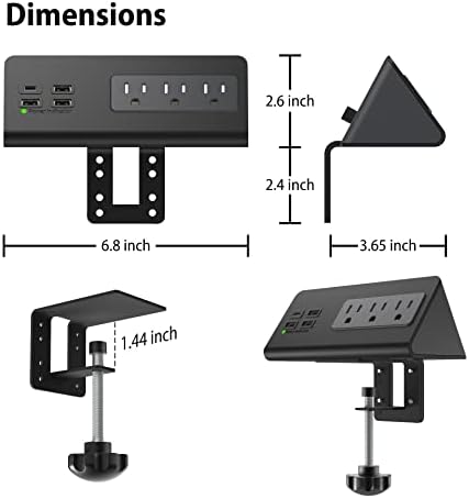 Clean Appearance–Unique Triangle Design for Desk Edge.One for All–Design with AC Ports and USB Ports,Charge Your Computer,Smartphone,iPad,Desk Lamp.Fit Many Occasions–This Power Strip Perfectly Mounted In Nightstand,Workbench,Office Desk,Coffee Table,Side Table or Dinner Table.TR Security–Tamper Resistant Design,More Safety In Use.Overload Protection–Maximum 125Volts/15Amp/1875Watts Output.Two Mounted Type–Desk Edge Screw Mount or Clamp Mount According Your Needs.