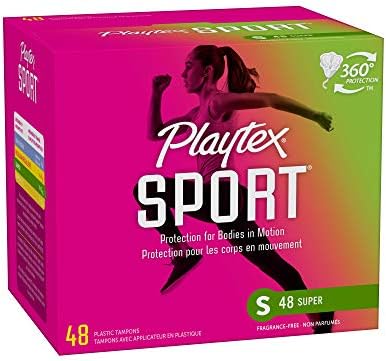 Playtex Sport Unscented super 48 Count. Only Playtex Sport tampons have a 360 Degree design and flexfit technology that moves the way you move. Playtex Sport tampons are great tampons for swimming, biking, running or whatever your activity of choice is. Playtex Sport tampons unscented, feature 360 Sport level Protection tampon designed to fit your body and its every move for a protective leakage barrier. With unique flexfit interlocking fibers Playtex Sport tampons work quickly to trap leaks. The contoured applicator of Playtex Sport tampons allow for comfortable, precise placement. Playtex Sport tampons keep you protected throughout your period. Playtex Sport tampons – play on!