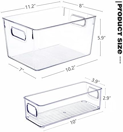 Product Name Clear Plastic Storage Bins- 8 pack Color Clear Size 11.2”/10.2” (Length) x 8” (Width) x 5.9” (Height), 10” (Length) x 3.9” (Width) x 2.9” (Height) Material PET Plastic Temperature resistance -20.0 ℃ ~ 50.0 ℃ Washing Instructions No Dishwasher Package Quantity 8 Pieces