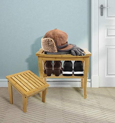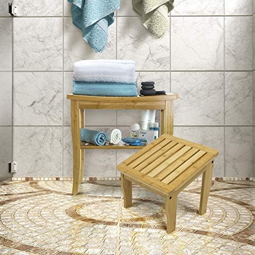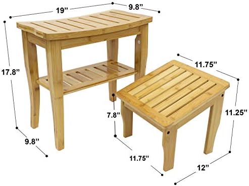 ECO-FRIENDLY DESIGN — Slotted curved seat with lower shelf — Built-in slates allow soap and water to pass through — Made of 100% bamboo construction — Color is natural — Wipe clean — Minimal assembly required — Instructions INCLUDED — Bench approx 19’’ L x 10’’ W x 18’’ H — Foot Stool approx 12’’ L x 11.75’’ W x 11.25’’ H